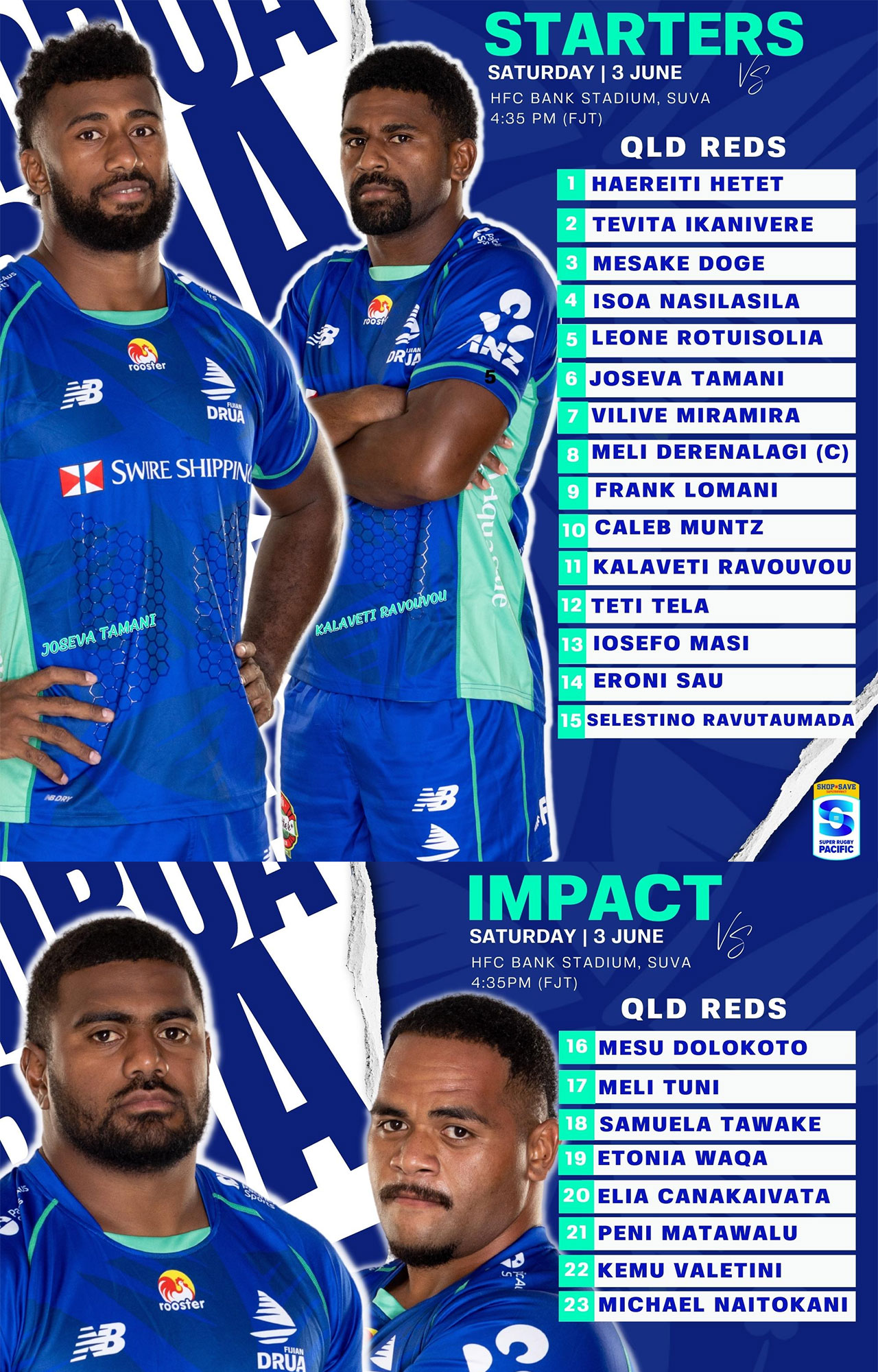 Frank Lomani (9) remains at halfback with Caleb Muntz (10) slotting in at flyhalf this week. Ravouvou (11) starts on the left wing and will partner with Eroni Sau (14) who shifts to the right wing. Tela (12) at inside centre position will partner Iosefo Masi (13) who is on the outside. Ravutaumada (15) completes the starting 15 at fullback.