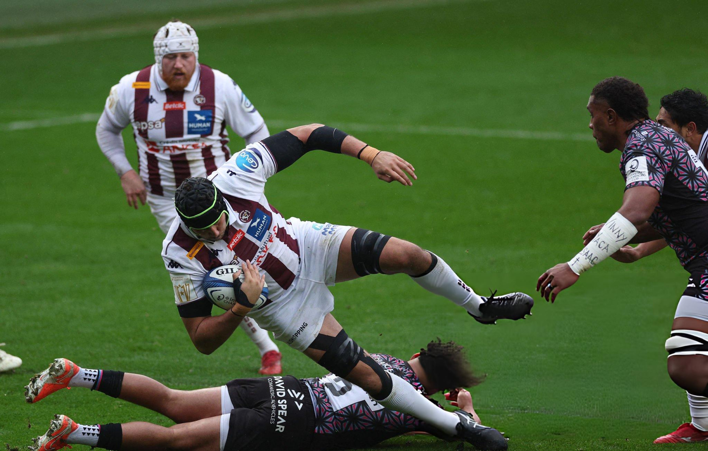 The electric winger runs it back from a kick and cops a high shot stepping two defenders. Bristol mount an attack and win another penalty from that and kick the points four minutes later. Bristol 15-20 UBB.