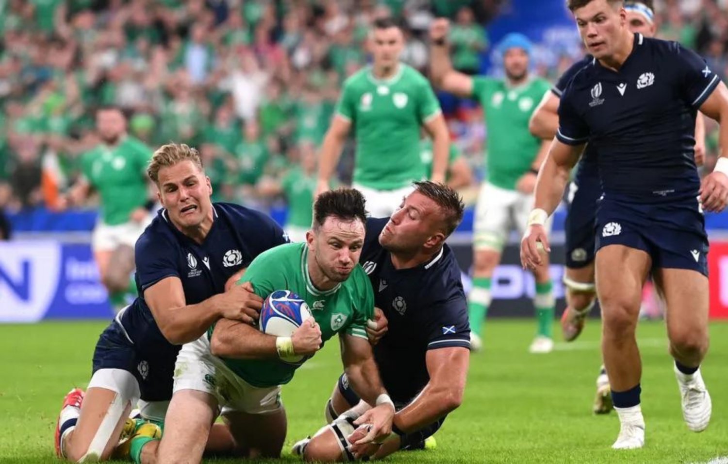 Ireland continued where they left off in the second half, grabbing two tries in 16 minutes. Scotland scored two tries in two minutes to give the scoreline some respectability but Ireland march on to a quarter-final against three-time winners New Zealand, while Scotland head home with South Africa taking second spot in Pool B.