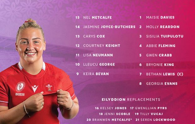15 Nel Metcalfe (Hartpury/Gloucester), 14 Jasmine Joyce-Butchers (Bristol), 13 Carys Cox (Ealing), 12 Courtney Keight (Sale), 11 Lisa Neumann (Harlequins), 10 Lleucu George (Hartpury/Gloucester), 9 Keira Bevan (Bristol); 1 Maisie Davies (Bristol), 2 Molly Reardon (Wales Lightning), 3 Sisilia Tuipulotu (Hartpury/Gloucester), 4 Abbie Fleming (Harlequins), 5 Gwen Crabb (Hartpury/Gloucester), 6 Bryonie King (Wales Lightning), 7 Bethan Lewis (captain, Hartpury/Gloucester), 8 Georgia Evans (Saracens)