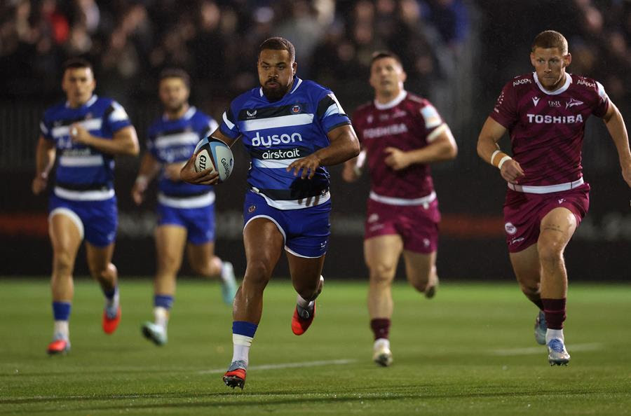 Bath Rugby: 15 Tom de Glanville, 14 Joe Cokanasiga, 13 Ollie Lawrence, 12 Max Ojomoh, 11 Henry Arundell, 10 Finn Russell, 9 Ben Spencer; 1 Beno Obano, 2 Tom Dunn, 3 Thomas du Toit, 4 Quinn Roux, 5 Ross Molony, 6 Josh Bayliss, 7 Sam Underhill, 8 Miles Reid