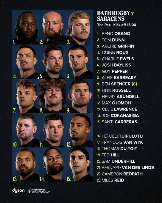 Bath Rugby: 1 Beno Obano, 2 Tom Dunn, 3 Archie Griffin, 4 Quinn Roux, 5 Charlie Ewels, 6 Josh Bayliss, 7 Guy Pepper, 8 Alfie Barbeary, 9 Ben Spencer, 10 Finn Russell, 11 Henry Arundell, 12 Max Ojomoh, 13 Ollie Lawrence, 14 Joe Cokanasiga, 15 Santi Carreras