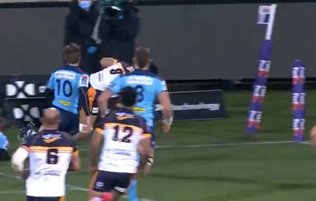 Pete Samu scores a brlliant try after Brumbies go through the hands, despite the rain.