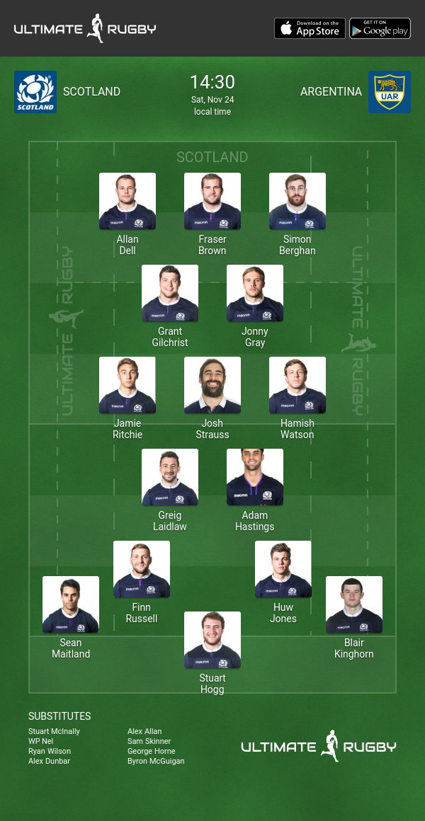 Huw Jones retains his place at outside-centre with Blair Kinghorn starting his first match of the autumn at wing. Stuart Hogg has recovered from his ankle knock to stay at full-back and Sean Maitland again plays on the wing.