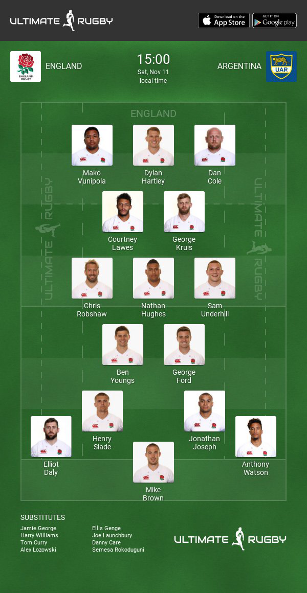 Seven players - Mike Brown (Harlequins), George Ford (Leicester Tigers), Dylan Hartley (Northampton Saints), Nathan Hughes (Wasps), Chris Robshaw (Harlequins), Henry Slade (Exeter Chiefs) and Sam Underhill (Bath Rugby) - who started in England’s last Test against Argentina in June retain their place this weekend.